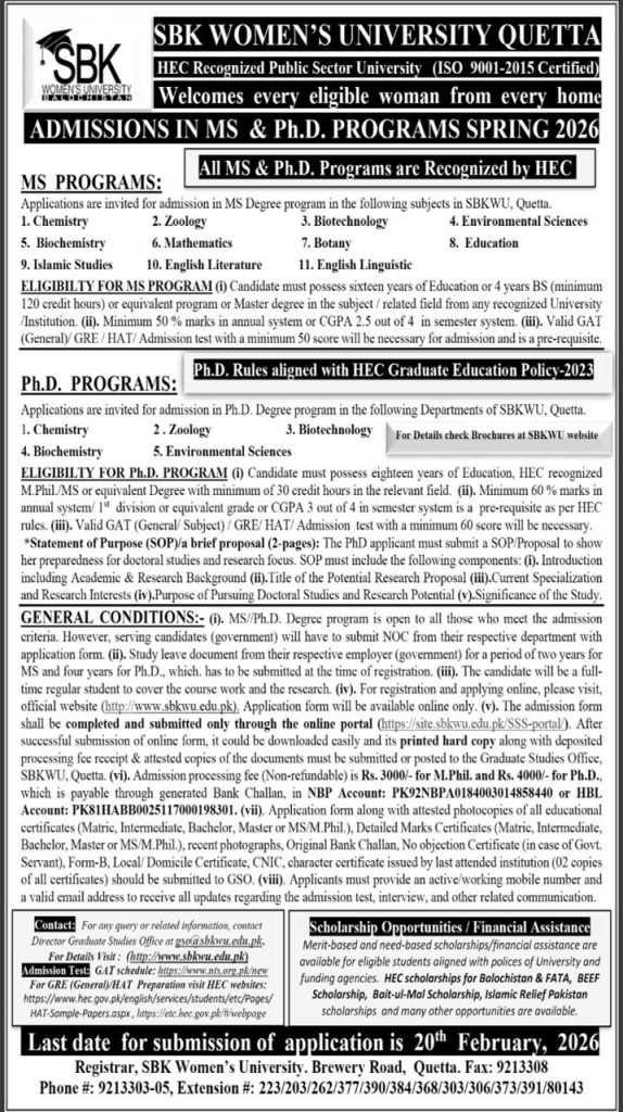SBK Women's University Admissions BS Masters MPhil PhD BS-ADMISSIONS - FALL 2025 MS and PhD - ADMISSIONS - Spring 2026 Pre-requisites for BS -Admissions fall-2025 Information regarding MS and PhD admissions in SBKWU M.Phil, Ph.D. Pre-Requisite Download Application Form Download/View Advertisement