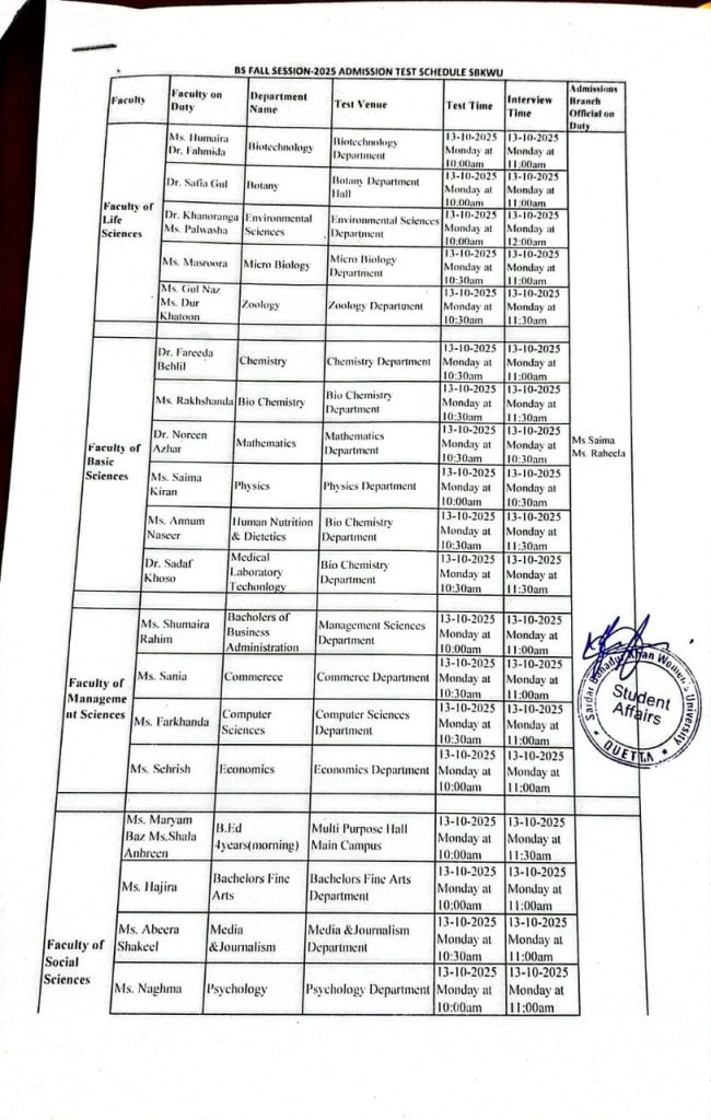 BS Admissions Schedule