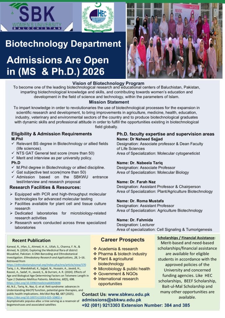 Biotechnology department was established in November 2009 at Sardar Bahadur Khan Women’s University Quetta. The only program offered then by the department was BS Biotechnology. Later, in 2014-2015 with the induction of PhD faculty members the department offered PhD and MPhil programs respectively.